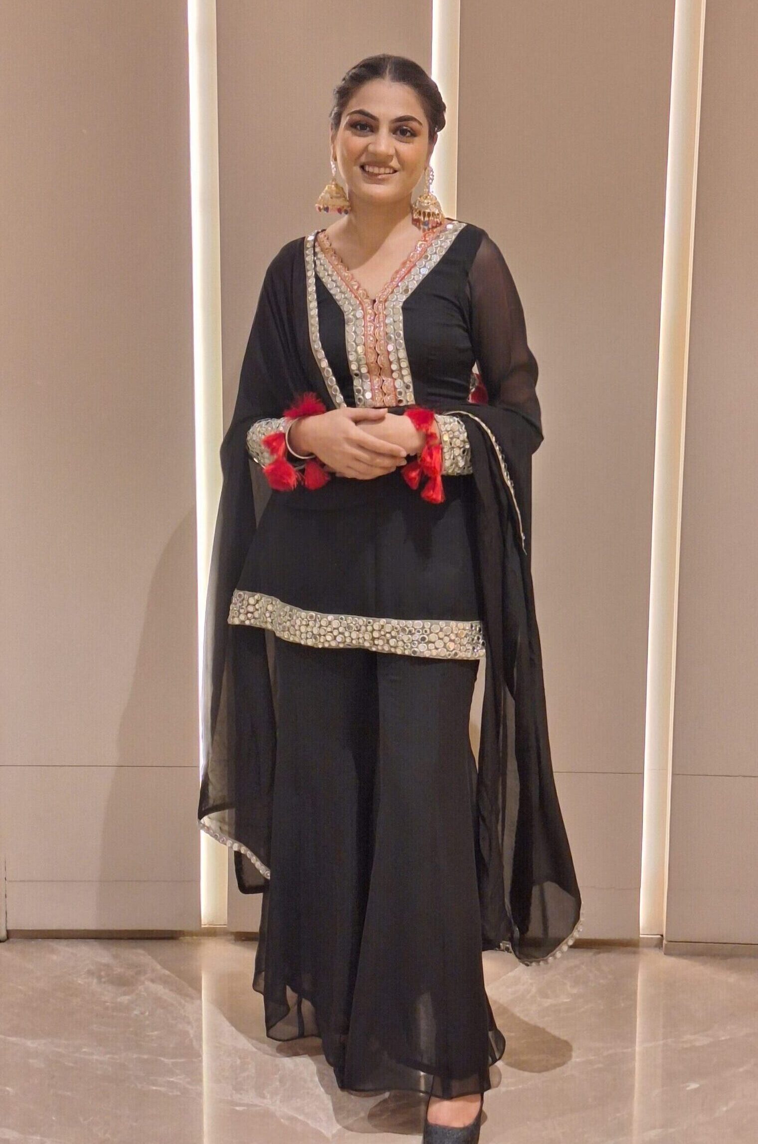 Details: Black kurti with multicolour floral & butterfly print, highlighted with lace detailing at the hemline. Orange palazzo finished with gotta lace and border lace. Matching orange dupatta finished with golden lace border.