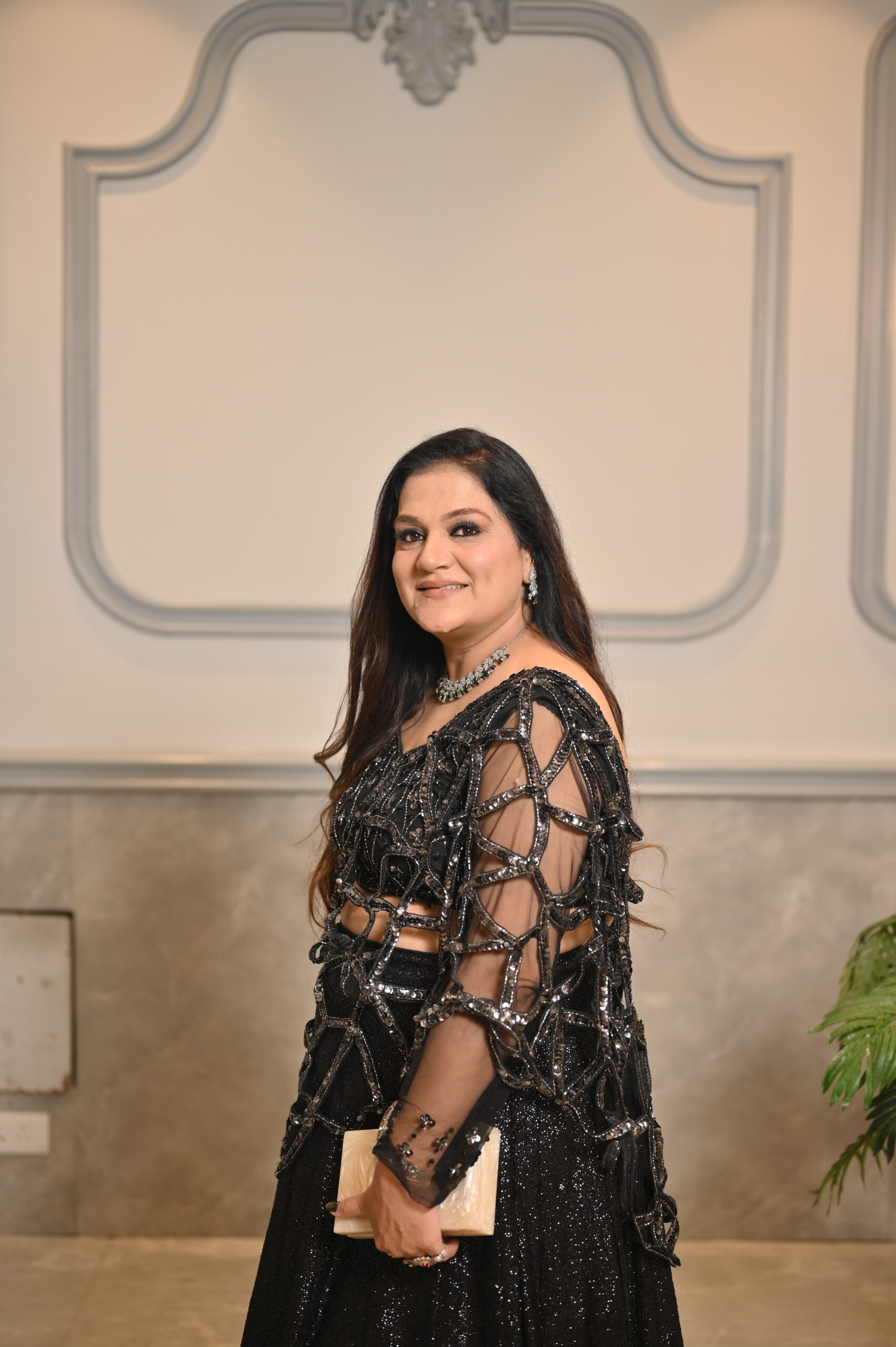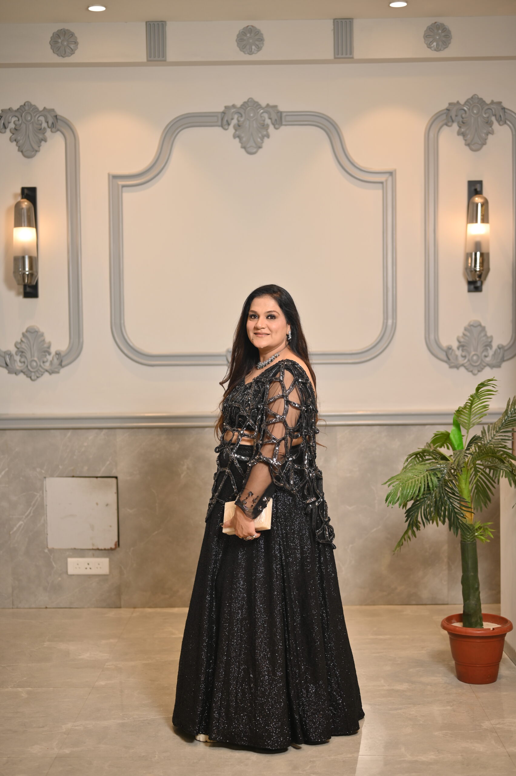 Details: Designer lehenga choli. Stylish cut-out Blouse with sheer full sleeves and intricate handwork. Net dupatta with bold criss-cross embellished pattern for a dramatic look. All-over sequin embroidery and bead detailing for a luxuries shine.