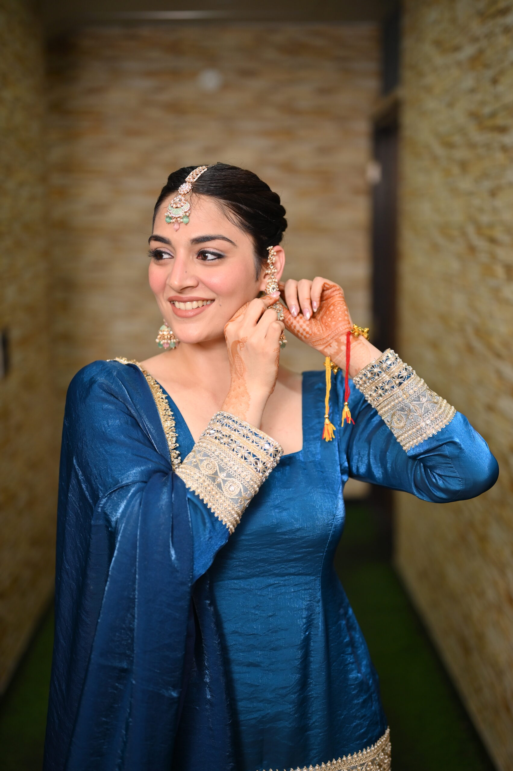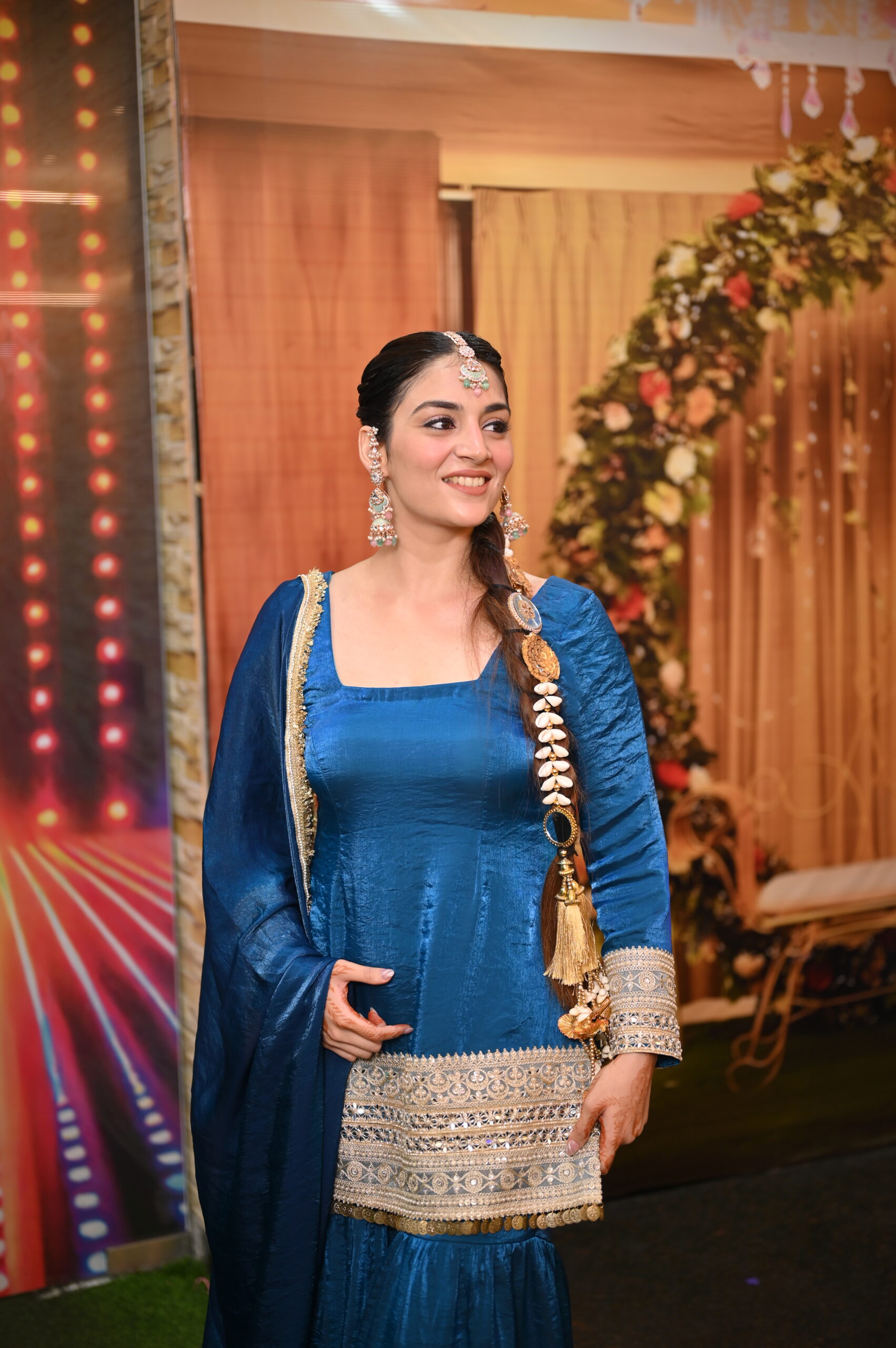 Details: Square neckline, full sleeves with detailed embellishments on the cuffs. Embellished hem with zari, mirror, and thread work in gold and silver lace. Multi-tiered design with flared sharara. Contrasting deep blue shade, gold lace edging for a regal tough.